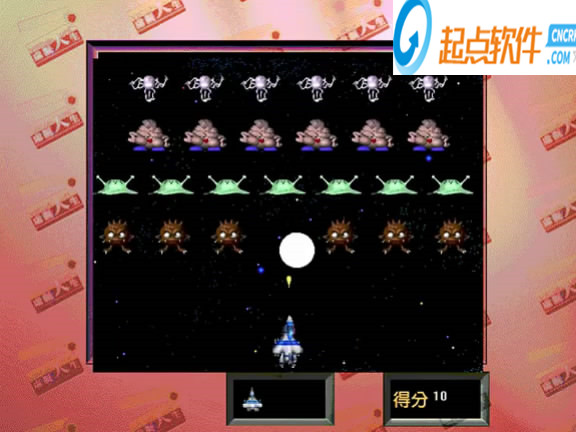 玩家操作戰(zhàn)斗機來擊退怪獸軍團,游戲類似FC的小蜜蜂,如戰(zhàn)斗機被怪獸發(fā)出的子彈擊中或飛機和怪獸成一條橫線的話游戲結束,按空格開炮,左右鍵躲避,獎勵金錢的小游戲。