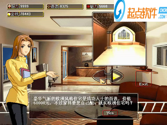 玩家買房子的格子,這里有四個房子可以買,60000的房子最理想的,買房子后可以去商店格買家具增長參數(shù),以后再次進入房產格可以投資,