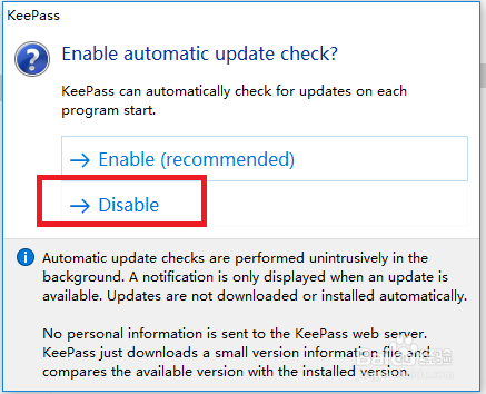 等待安裝完成后點(diǎn)擊finish結(jié)束安裝進(jìn)程,然后啟動(dòng)程序。第一次會(huì)詢(xún)問(wèn)你是不是每次啟動(dòng)后都要檢查更新,因?yàn)閗eepass是一個(gè)開(kāi)源軟件,更新的速度非常快。提醒也很麻煩,所以我選擇了disable,如果你想嘗鮮,則可以選擇enable