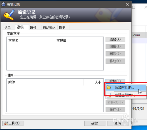 在記錄的賬號(hào)條目上右鍵 編輯/查看記錄 ,在彈出的 編輯記錄 窗口,點(diǎn) 高級(jí) ,在附件欄點(diǎn)擊 添加(H) 按鈕