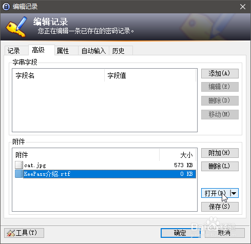 這樣附件就添加成功了。KeePass內(nèi)置了文件查看器,選擇附件點(diǎn)擊右下 打開(kāi) 按鈕,就可以查看附件了。