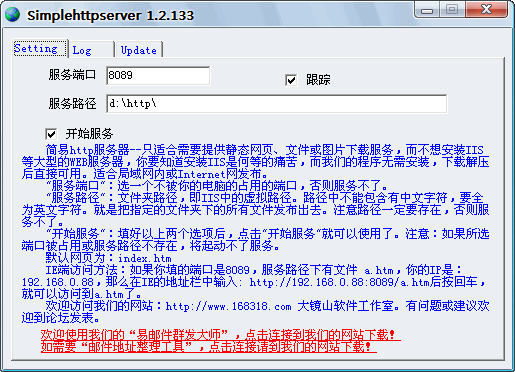 > 簡(jiǎn)易http服務(wù)器--只適合需要提供靜態(tài)網(wǎng)頁(yè)、文件或圖片下載服務(wù),而不想安裝IIS等大型的WEB服務(wù)器,你要知道安裝IIS是何等的痛苦,而我們的程序無(wú)需安裝,下載解壓后直接可用。適合局域網(wǎng)內(nèi)或Internet網(wǎng)發(fā)布。