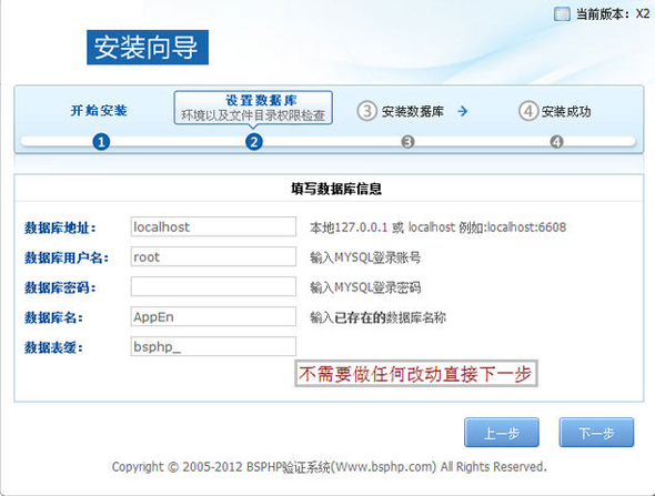 下載后修改 “Data/inc.config.php”中的數(shù)據(jù)庫名稱一項,改為自己申請是數(shù)據(jù)庫名稱,通過SVN或百度云開放平臺將代碼上傳,執(zhí)行安裝程序“域名/install”,在提示輸入數(shù)據(jù)庫地址、用戶名、密碼的地方不需要輸入任何內(nèi)容,直接下一步即可。如果成功提示進(jìn)入后臺。