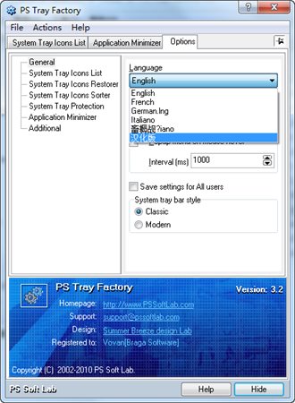PS托盤工廠是一個(gè)強(qiáng)大而靈活方便的工具旨在控制其他所有圖標(biāo)在任務(wù)欄的系統(tǒng)托盤。PS托盤工廠將幫助您管理的所有應(yīng)用程序把他們的圖標(biāo)在任務(wù)欄上托盤。當(dāng)你已經(jīng)安裝了PS托盤工廠,你會(huì)忘記這個(gè)問題缺乏空間在系統(tǒng)托盤中,也將得到一個(gè)簡(jiǎn)單、快速和方便的工具來處理那些應(yīng)用程序。簡(jiǎn)而言之,所有的Windows用戶將得到這個(gè)方便的和強(qiáng)大的工具可供選擇,而只有Windows XP用戶有一個(gè)想法。對(duì)于后者,我們已經(jīng)有了一個(gè)美好的驚喜,因?yàn)楣δ躊S的托盤工廠超過標(biāo)準(zhǔn)的內(nèi)置函數(shù)的操作系統(tǒng)。與PS托盤工廠可以快速隱藏系統(tǒng)托盤圖標(biāo)和容易管理它們。