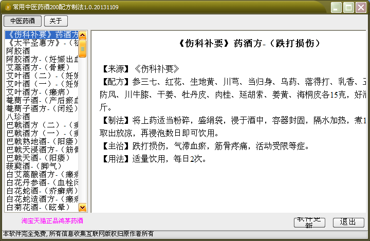運行本軟件,在左側(cè)的列表中單擊你想查看的藥酒配方,然后就會在右側(cè)方框內(nèi)顯示相應(yīng)配方