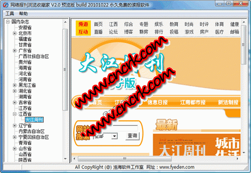 網(wǎng)絡(luò)報(bào)刊瀏覽收藏家 V2.0 簡(jiǎn)體中文綠色免費(fèi)版 網(wǎng)絡(luò)報(bào)刊瀏覽收藏家是目前國(guó)內(nèi)功能最強(qiáng)的新聞 閱讀器??梢蚤喿x國(guó)內(nèi)外千余種報(bào)刊雜志、新聞網(wǎng)站、電視廣播,內(nèi)置可分類新 聞?lì)l道。軟件界面簡(jiǎn)潔、操作簡(jiǎn)便,既可在內(nèi)置瀏覽器中瀏覽新聞,也可在系統(tǒng) 默認(rèn)的瀏覽器中瀏覽新聞