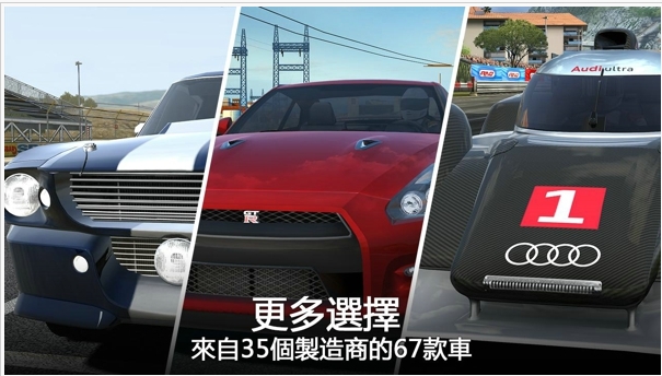 在操控上,本作提供了4種操控模式,大致上分為重力感應(yīng)和方向盤控制兩種,在局部細(xì)節(jié)有所調(diào)整。需要特別提醒的一點(diǎn)就是,本作中沒有漂移的設(shè)定,除了方向和剎車控制外,沒有多余的操控體驗(yàn),這一點(diǎn)和真實(shí)賽車的簡(jiǎn)單操控模式比較相似,不過還是趕不上真實(shí)賽車3更加專業(yè)和復(fù)雜化的操控選項(xiàng)。沒有漂移、沒有A8式的撞毀、加上更大的慣性、更加真實(shí)的彎道,因此在游戲中你需要做的就是選擇最佳的行進(jìn)路線然后小心謹(jǐn)慎的駕駛。