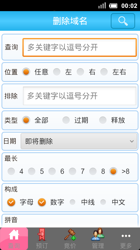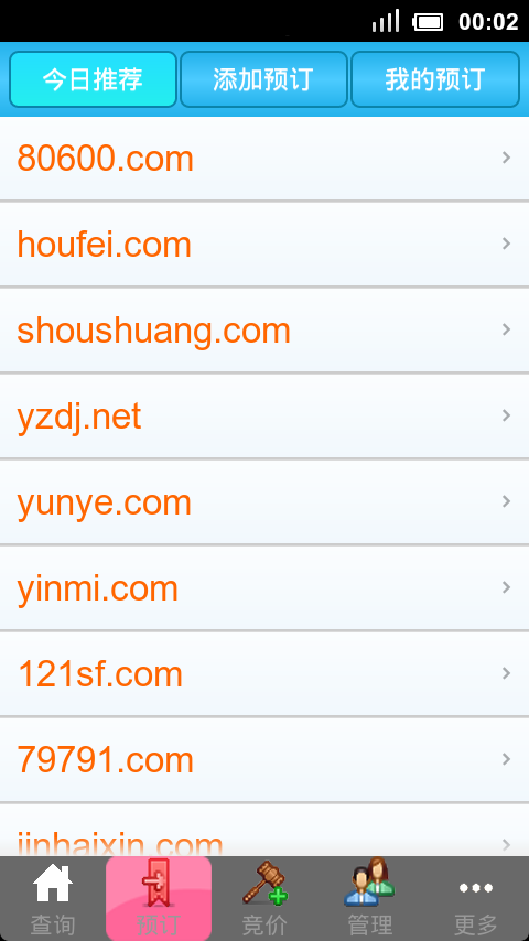 愛(ài)訂米是一款手機(jī)搶域名應(yīng)用,可查詢(xún)過(guò)期刪除的域名,點(diǎn)擊添加預(yù)訂,即可參加競(jìng)價(jià),方便好用。最重要的是你能在這里強(qiáng)盜很多好域名,快來(lái)下載試試吧