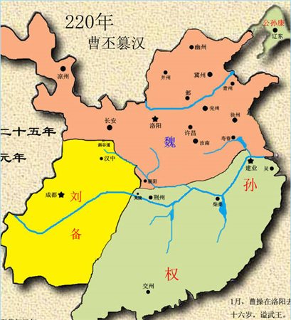 三國(220年-280年)是中國東漢與西晉之間的一段歷史時期,主要有曹魏、蜀漢及東吳三個政權(quán)。赤壁之戰(zhàn)中曹操被孫劉聯(lián)軍擊敗,形成了三國鼎立的雛型。220年曹操之子曹丕篡漢稱帝,國號“魏”,史稱曹魏,三國歷史正式開始。次年劉備在成都重建漢朝,史稱蜀漢。222年劉備在夷陵之戰(zhàn)失敗,孫權(quán)獲得荊州大部。223年劉備駕崩,諸葛亮輔佐劉備之子劉禪與孫權(quán)重新聯(lián)盟、恢復(fù)國內(nèi)生產(chǎn)。229年孫權(quán)稱帝,國號“吳”,史稱東吳,至此三國正式鼎立。此后的數(shù)十年內(nèi),蜀漢諸葛亮、姜維多次率軍北伐曹魏,但始終未能改變?nèi)愣α⒌母窬?。后期曹魏的實?quán)漸漸被司馬氏掌控。263年,曹魏的司馬昭發(fā)動魏滅蜀之戰(zhàn),蜀漢亡。兩年后司馬昭病死,其子司馬炎廢魏元帝自立,國號“晉”,史稱西晉。280年,西晉滅亡東吳,統(tǒng)一中國。至此三國時期結(jié)束,進入晉朝。