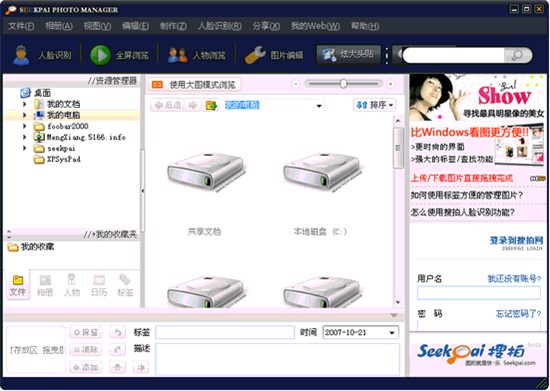 此外,豐富的標(biāo)簽功能,方便的檢索功能,簡(jiǎn)易的編輯功能,精彩紛呈!更有創(chuàng)新地把智能人物識(shí)別技術(shù)應(yīng)用于圖片檢索中和新近推出的搜拍明星搜中, 更是將圖片的管理與娛樂(lè)融合在一起,使得您對(duì)圖片的管理更加輕松方便,妙趣橫生。