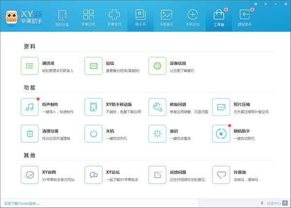 XY蘋果助手的工具箱頁(yè)面分為:資料,功能,其他三部分。資料中包含:通訊錄,短信,設(shè)備信息。功能中包括:XY蘋果助手,修復(fù)閃退,照片壓縮,大文件清理,清理垃圾,關(guān)機(jī),重啟。其他中包括:XY蘋果助手論壇,關(guān)于我們,反饋問題。由此看來,XY蘋果助手的工具箱頁(yè)面更像是一個(gè)導(dǎo)航頁(yè)面,為用戶提供所需功能的指引。