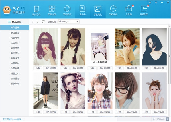 1、界面簡(jiǎn)單 易于操作XY蘋果助手PC版的操作界面設(shè)計(jì)美觀,易于操作,采用了簡(jiǎn)易式安裝步驟,安裝完畢后接入設(shè)備就可立即開始使用。主要?jiǎng)澐譃榱恕拔业脑O(shè)備、蘋果應(yīng)用、蘋果游戲、壁紙下載、手機(jī)體檢、工具箱、越獄助手”六大欄目,欄目劃分清晰,易于用戶定位。