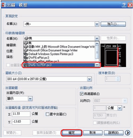 步驟四、在「印表機(jī)/繪圖機(jī)」的名稱內(nèi)選擇「DWG To PDF.pc3」,其餘設(shè)定可以依照個(gè)人需求調(diào)整,點(diǎn)選「確定」。
