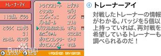 訓練家情報功能在玩家獲得五個徽章之后開啟,存有道館訓練家和神奇寶貝聯(lián)盟成員的信息,并會跟蹤冒險途中神奇寶貝訓練家再戰(zhàn)請求的信息。