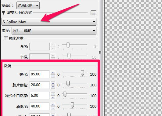 PhotoZoom圖片無(wú)損放大工具不只這些,還可以在下方設(shè)置調(diào)整大小的方式,每種方式獲得的效果不一樣,大家可以多嘗試一下,然后下面還可以進(jìn)行微調(diào)。