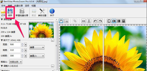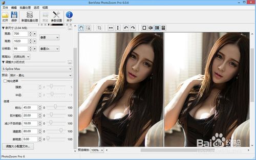 在PhotoZoom的右側(cè)可以切換軟件的預(yù)覽方式,切換成對(duì)比方式,左側(cè)是PhotoZoom處理的效果,右側(cè)是圖片直接放大的效果。從這里可以直觀的看到軟件的處理效果非常好。