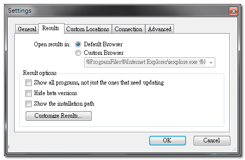▼ Results 可對(duì)掃描結(jié)果作設(shè)定,例如你不想用預(yù)設(shè)瀏覽器開(kāi)啟掃描結(jié)果,那么可以自訂瀏覽器;或是顯示所有軟件項(xiàng)目(不局限于是否更新)、隱藏 Beta 的更新項(xiàng)目..等。
