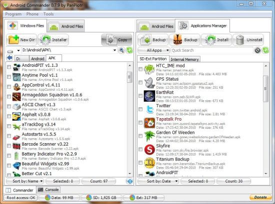包括文件管理,電腦到手機(jī)/手機(jī)至電腦。程序管理,安裝卸載,備份。apk簽名,SQLite數(shù)據(jù)庫(kù)文件的瀏覽,以及手機(jī)刷機(jī),系統(tǒng)備份等。