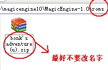 2,將下載到的PCE游戲ROM,放到上面說的roms文件夾下,注意,ROM是ZIP格式,你最好不要改變ROM的名字,也是不要解壓縮更不要改后綴名,比如下載某PCE游戲得到的文件是 bonk's adventure (u).zip可以直接放到roms文件夾下了。