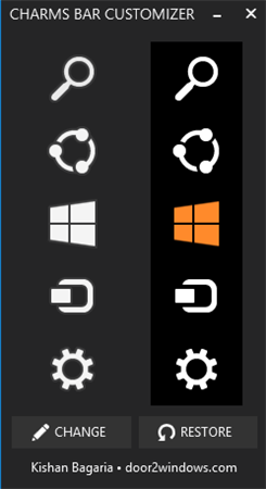 Windows 8.1 Charms Bar 是綠色軟件,使用也非常簡單,軟件界面右側(cè)是系統(tǒng)默認(rèn)樣式;左側(cè)是我們的控制區(qū)域,想改變哪個圖即在左側(cè)雙擊之,選擇好自定義的圖標(biāo)點(diǎn)擊“CHANGE”即可成功!當(dāng)然還可以通過右側(cè)下方的“RESTORE”來恢復(fù)Windows的默認(rèn)樣式。