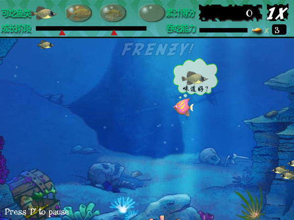 大魚吃小魚是一款經(jīng)典的休閑游戲,簡單的操作更是深入人心。大魚吃小魚游戲的主角是一條很小的熱帶魚,游戲的方式是讓主角先吃下與自已體型相同的魚,等吃下一定的數(shù)量且主角的體型變大后,就能再吃下其它體型更大的魚類,而且只要讓CROWTH 的值填滿,就能進(jìn)入到下一關(guān)。