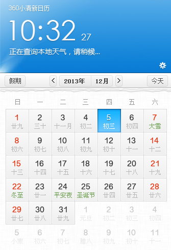 360小清新日歷是360安全衛(wèi)士中的一款桌面日歷工具,能夠顯示陰歷、陽(yáng)歷、天氣狀態(tài)和時(shí)間,既簡(jiǎn)單又全面,而且不占資源,可開機(jī)啟動(dòng)。