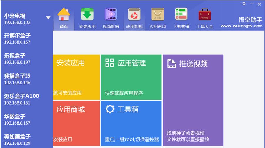 悟空電視盒子助手是一款優(yōu)秀的Windows軟件。悟空電視助手適用于小米盒子、樂(lè)視盒子等絕大部分市場(chǎng)上的智能電視智能機(jī)頂盒設(shè)備。悟空電視助手操作簡(jiǎn)單,下載后無(wú)需安裝即可使用。通過(guò)電腦與盒子的連接,可以方便的給悟空電視盒子安裝軟件和卸載軟件,是一款必備的盒子管理軟件。