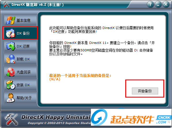 2、選擇“DX備份”,點(diǎn)擊“開(kāi)始備份”即可備份當(dāng)前DirectX組件信息,