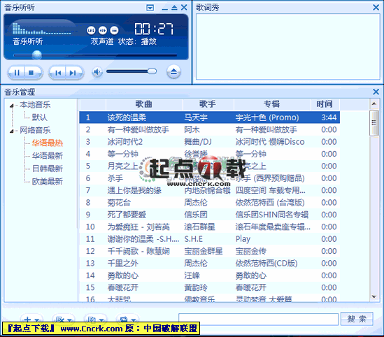 音樂聽聽 V1.5.0 簡體中文綠色版 音樂聽聽是一款完全免費的音樂軟件,集歌曲搜索、在線試聽、播放、管理、歌詞自動配對等眾多功能于一身,擁有自主研發(fā)的全新音頻引擎;是國內(nèi)功能最強的音樂軟件。 真正永久免費且無需注冊,不存在任何功能或時間限制