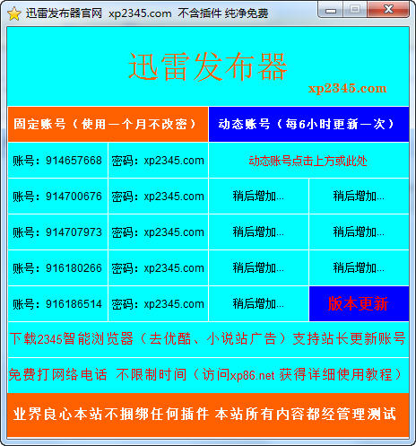 迅雷發(fā)布器每天定時(shí)、穩(wěn)定更新迅雷會(huì)員賬號(hào)。同時(shí)迅雷發(fā)布器官網(wǎng)擁有永久賬號(hào),每個(gè)月管理會(huì)開通10個(gè)左右迅雷白金賬號(hào)。迅雷發(fā)布器綠色無毒,下載后解壓即用。