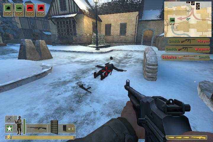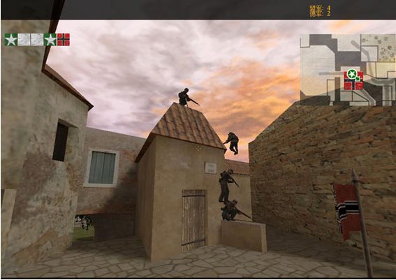 進入勝利之日后你同樣需要選擇參戰(zhàn)的一方,雙方各有6個兵種供選(英軍沒有支援步兵),包括步槍兵、沖鋒槍、支援步兵、狙擊手、機槍手,火箭炮兵以及少數(shù)地圖上德國傘兵,和CS不一樣的是你只能使用相應的武器。在游戲中你可隨時改變兵種,但要等到你死亡復生后才能生效。與反恐精英所采用的回合制不同,在勝利之日里死亡后不用再百無聊地耐著性子等待這局結束,你會在過了一段時間后(根據(jù)你和其他玩家的死亡時間0~10秒不等)復生。你可從復生點再次進入戰(zhàn)場繼續(xù)拼殺,扮演類似援軍的角色。由于游戲設置不需要你去“埋包”,也沒有可解救的人質(zhì),雙方戰(zhàn)斗以奪旗為主(DoD1.3推出后,增加了炸火炮、占電臺、搶油車等任務)。在每一張地圖里都會有數(shù)量不等的固定旗幟,雙方的主要任務是爭奪旗幟,在奪旗的同時還要守住旗幟,每局30分鐘左右,以斃敵數(shù)量和奪旗來區(qū)分勝負。