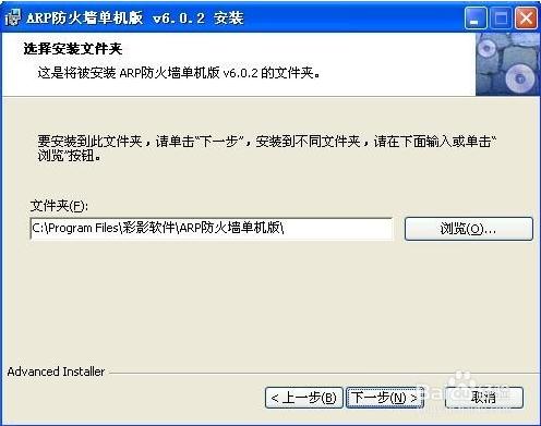 點(diǎn)擊瀏覽,C:\Program Files\彩影軟件\ARP防火墻單機(jī)版\,選擇路徑。