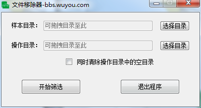 A目錄中有文件a.dll、b.exe、c.ini,欲刪除之,并刪除A目錄其他位置(含子目錄)與a.dll、b.exe、c.ini相同(取決于SHA1校驗(yàn)值,與文件名無關(guān))的文件,則可先新建目錄B并將a.dll、b.exe、c.ini移至目錄B中,然后“樣本目錄”選擇“B”,“操作目錄”選擇“A”,若勾選“同時(shí)清除操作目錄中的空目錄”(“樣本目錄”不選擇時(shí)該功能單獨(dú)工作)則A目錄中的空目錄會被刪除。安全起見,刪除時(shí)文件會被暫時(shí)移至程序同級的“文件回收”目錄(注意:執(zhí)行操作時(shí)該目錄會被清空)。