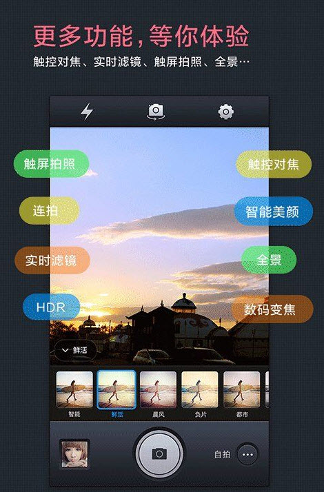 藝術(shù)家智能模式:利用百度獨創(chuàng)的場景分析系統(tǒng)(Scene Analysis System,簡稱SAS)對拍攝對象自動進(jìn)行識別和分析,如人物面部、被拍攝物體色調(diào)、亮度、運(yùn)動軌跡、對比度等,根據(jù)照片分析結(jié)果進(jìn)行智能美化。每個人都能拍出專業(yè)水準(zhǔn)的照片!快速模式:利用交叉濾波圖像增強(qiáng)算法和針對手機(jī)攝像頭CMOS圖像感應(yīng)器進(jìn)行適配加速優(yōu)化,從軟件和硬件雙向提升圖像畫質(zhì),讓手機(jī)也能拍出 消費級相機(jī)般的高畫質(zhì)照片。自拍模式:原來你就是素顏美女!利用全球領(lǐng)先的81點人 臉檢測技術(shù)和百度人像自動美容處理專利算法,實現(xiàn)實時美容效果,使皮膚亮白光滑,提高肌膚通透度,還你嬰兒般的水嫩肌膚!掃一掃:快速、準(zhǔn)確識別二維碼和條形碼,再也不用安裝單獨的應(yīng)用了,比價搜索更方便!風(fēng)景模式:采用全球領(lǐng)先的圖像識別處理算法,自動調(diào)節(jié)拍攝亮度、對比度等,與您共同記錄每 一處絕美風(fēng)景。