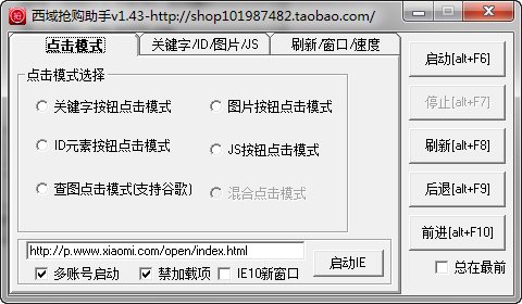 西域小米搶購助手是一款集關鍵字、ID元素、JS、圖片四大點擊模式為一體的自動點擊類網(wǎng)頁輔助軟件,同時也是一款小米搶購軟件,用來搶購小米官網(wǎng)活動請保持默認即可,建議同一個賬號開多個頁面,這樣能提高搶購成功率。此小米搶購軟件為網(wǎng)上收集而來,本站不負任何法律責任,若有侵權請來信告知!