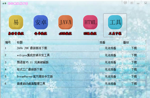 雨軒教程發(fā)布器可用來方便快捷的下載易語言。java,html,和安卓的教程已經(jīng)常用工具的下載!事實監(jiān)控網(wǎng)絡(luò)數(shù)據(jù)!