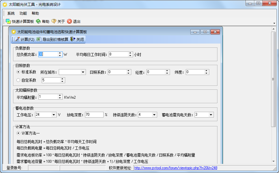 太陽能光伏工具是一款適用于太陽能開發(fā)和研究人員的輔助計算工具,太陽能光伏計算軟件可以對電池選取、設(shè)備價格、日照系數(shù)等參數(shù)做出快速的計算,供設(shè)計人員們參考和使用。
