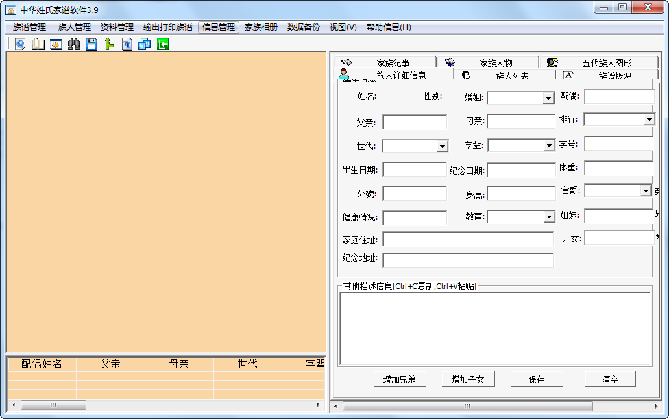 中華姓氏家譜是一款功能強(qiáng)大的族譜管理軟件,可以譜修全國各個(gè)姓氏的族譜,修好的族譜可以用word文檔輸出,還能夠在同一軟件上管理本家族和其他家族的資料,同步資料。