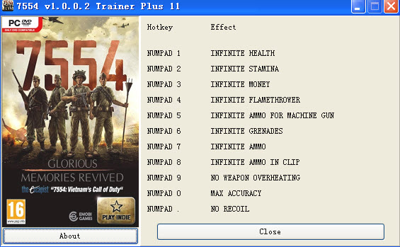 7554修改器是一款射擊游戲7554的作弊器,是玩家必不可缺的游戲輔助工具之一,有11項(xiàng)強(qiáng)大的修改功能,降低了游戲難度,讓你更好的體驗(yàn)游戲。7554是一款第一人稱(chēng)射擊類(lèi)游戲,游戲以逼真的細(xì)節(jié)和出色的圖形品質(zhì),真實(shí)地展現(xiàn)了越戰(zhàn)中最殘酷的戰(zhàn)斗。游戲以1946年至1954年兵荒馬亂的越南為背景,劇情上將重現(xiàn)這一時(shí)期越南發(fā)生的殘酷戰(zhàn)爭(zhēng)。