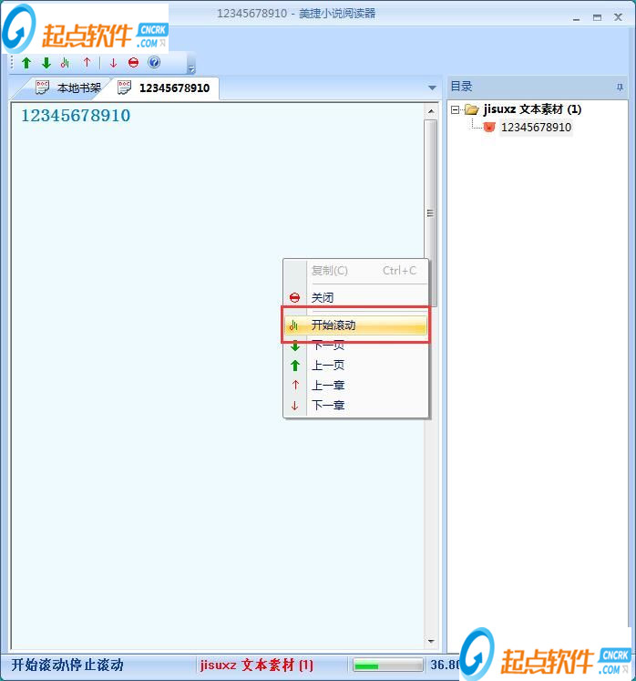 美捷小說閱讀器支持小說自動滾動播放。用鼠標(biāo)右鍵點擊TXT小說閱讀器的區(qū)域,在右鍵菜單中點擊開始滾動,就可以開始使用自動滾動播放功能進行小說閱讀了;
