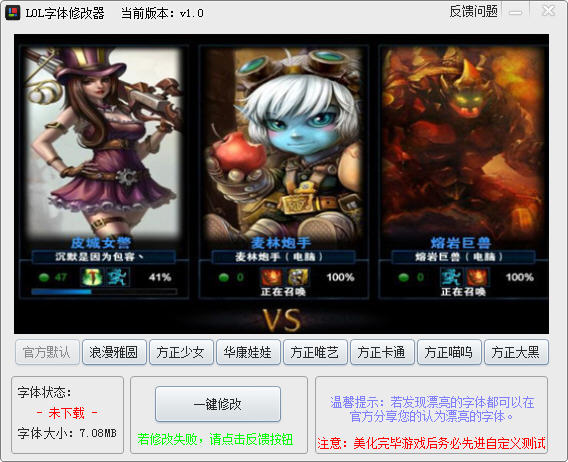 玩家可以通過該LOL字體修改工具將游戲字體修改成官方默認(rèn)、浪漫雅圓、方正少女、華康娃娃、方正唯藝、方正卡通、方正喵嗚、方正大黑等字體。