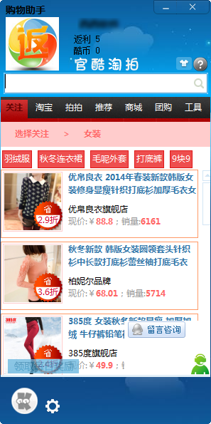 qq酷購(gòu)物助手是專為網(wǎng)購(gòu)愛(ài)好者提供的購(gòu)物返利工具,qq酷購(gòu)物助手下載將大多數(shù)生活小工具匯集在小面板上,使操作更加便捷,讓每位網(wǎng)購(gòu)著用最少的錢(qián)買到最有價(jià)值的物品。