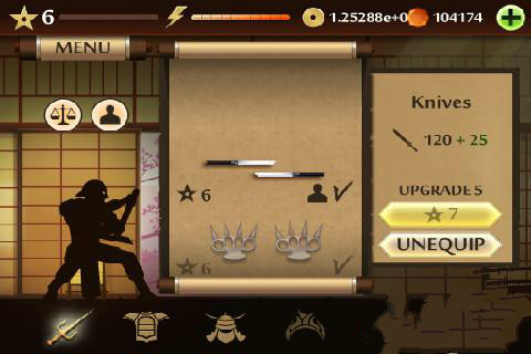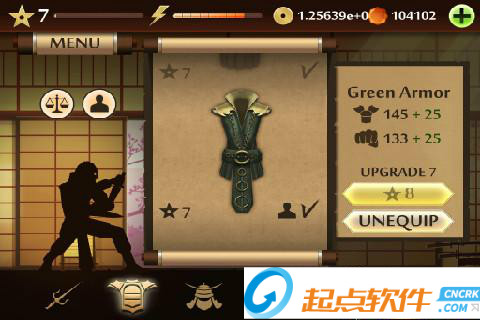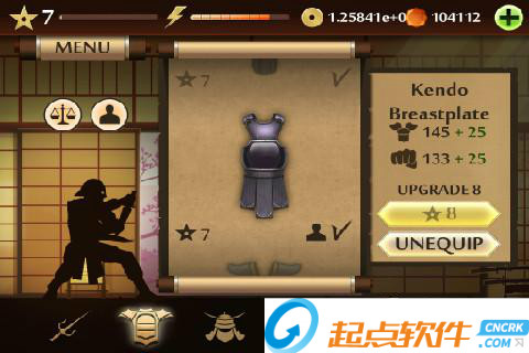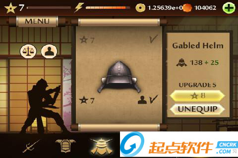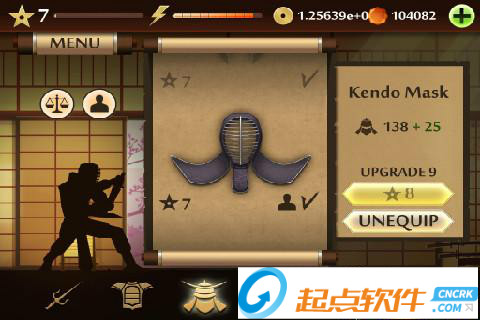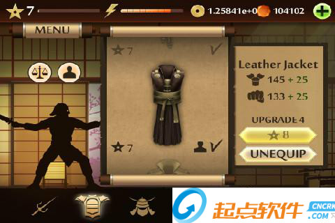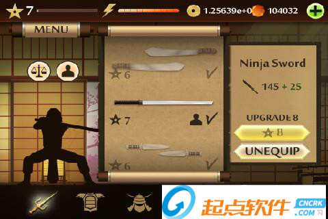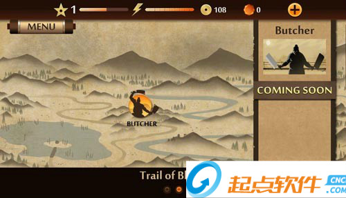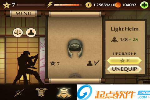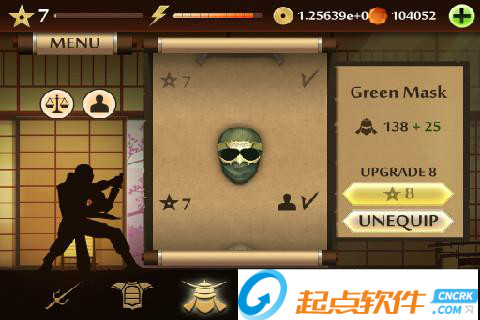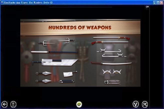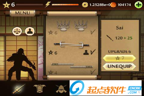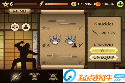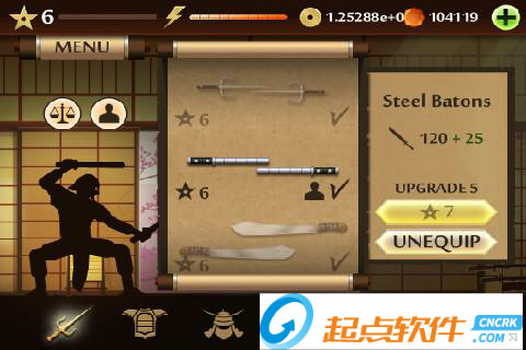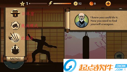 2、MENU菜單:點擊左上角的MENU,可以展開面板,第一個圖標是進入訓練室,在里面可以進行招式的演練;第二個是挑戰(zhàn)模式,進入之后可以選擇相應的“關卡”來和各個忍者進行戰(zhàn)斗;第三個是武器庫,可以用金幣或者鉆石來購買武器、護甲和頭盔;最后一個圖標的功能還沒有上線~