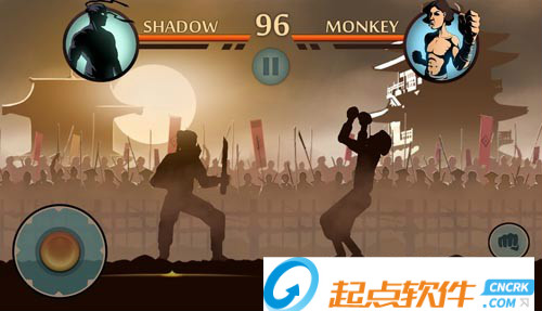 1、游戲操作:屏幕左側的虛擬搖桿控制角色的移動和站位。左右方向是移動鍵,上鍵則是跳躍,按下鍵可以蹲下。右邊的2個按鈕也很明顯,一個拳頭表示用手攻擊,腳的圖標則可以用腳踢。