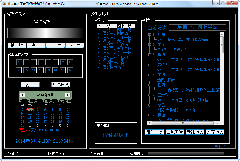 舞廳燈光控制系統(tǒng)支持舞曲限時功能,即可設(shè)置每種舞曲的播放長度,免去人工修改舞曲時長。 本軟件支持音量自動控制功能,即可設(shè)置每種舞曲的播放音量,以適應(yīng)不同曲子的音量要求。本系統(tǒng)硬件采用單板機(jī)(微型計算機(jī))控制,可控制16路燈光,如有需求,可無限擴(kuò)展為32路、64路等。每路輸出電流為10A,可滿足一般需求,也可定制擴(kuò)大容量;