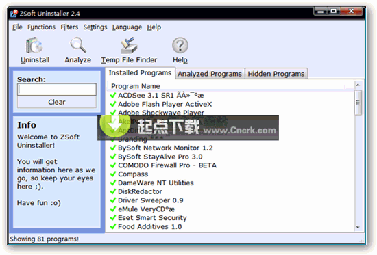 ZSoft Uninstaller 是一款免費的軟件卸載工具,它能夠讓使用者以快速及簡單的方式卸載不想要使用的軟件,使用者只要于清單中找到想要卸載的軟件(或是使用搜尋功能來快速搜尋),就能夠在選定后直接按下移除鈕來將它卸載。對于一些在系統(tǒng)內(nèi)建的管理器中無法卸載的項目, ZSoft Uninstaller 也能夠幫你直接進行強迫刪除,讓那些已經(jīng)被移除卻又留在你的安裝清單中的礙眼項目從此消失不見喔。此外, ZSoft Uninstaller還提供了注冊機碼清除功能,讓你在移除軟件時,能夠順便卸載該軟件殘留在系統(tǒng)中的機碼,實在是項方便又貼心的功能喔