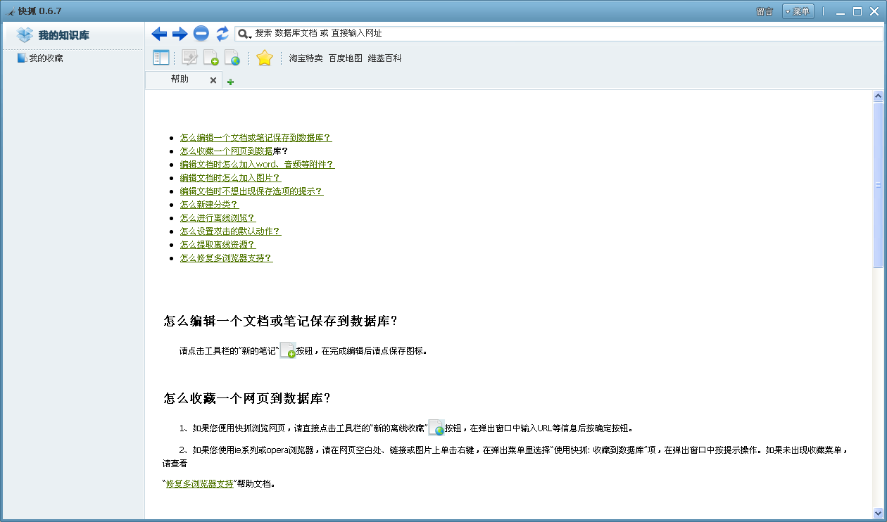 快抓是離線瀏覽器是一款知識(shí)庫(kù)儲(chǔ)存管理軟件。它可以收藏網(wǎng)頁(yè)、離線瀏覽、捕捉圖片、保存音頻、錄入文檔等等10幾種用處。讓您的文件儲(chǔ)存有條有理,更容易尋找。
