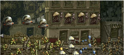 火星人:第六關(guān)出現(xiàn),章魚般的外形相信是來自于赫伯特·喬治·威爾斯的科幻小說《世界大戰(zhàn)》的發(fā)想,灰色的為一般型,發(fā)射黃色的泡泡狀子彈;黑色的為精銳部隊,有的會發(fā)射出速度更快的藍(lán)色子彈。后來在SVC Chaos: SNK VS. CAPCOM和NEO GEO Battlecoliseum中此角色作為隱藏人物出場。