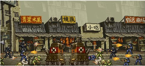 從系統(tǒng)來講MS在一出場的時候就已經(jīng)近乎完美。8方向跳躍射擊、主槍火力品種全面、大威力拋物線手雷再加上近身速度極快的匕首攻擊,一個全能型的蘭博式主角誕生了。而每關(guān)必定出場的乘物——坦克兵器Metal Slug更是具備了明星所需要的一切要素,凡是見過這款游戲的人無不對這部Q版小坦克著迷——廢話,有誰見過會跳著前進還會趴下的坦克。