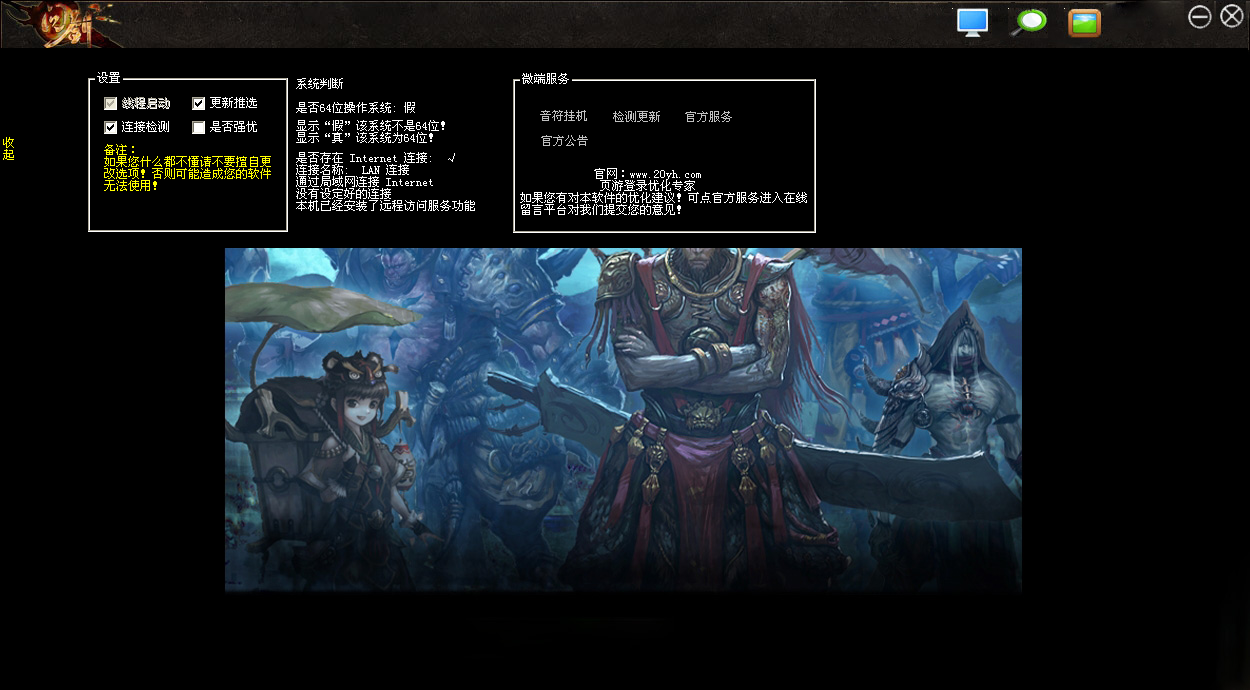 問劍超微端由頁游專業(yè)優(yōu)化團隊音符TEAM為網(wǎng)頁游戲傾力打造的游戲登陸優(yōu)化工具。軟件主要用于輔助玩家快速登陸游戲和畫面優(yōu)化等。軟件有點類似于官方微型客戶端。